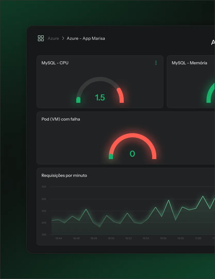 Dashboards que conectam todos os pontos: do erro no frontend ao problema no banco de dados. Visualize dependências, impactos no negócio e correlações em uma única tela. Seus engenheiros focam em desenvolver, não em participar de "war rooms" intermináveis.